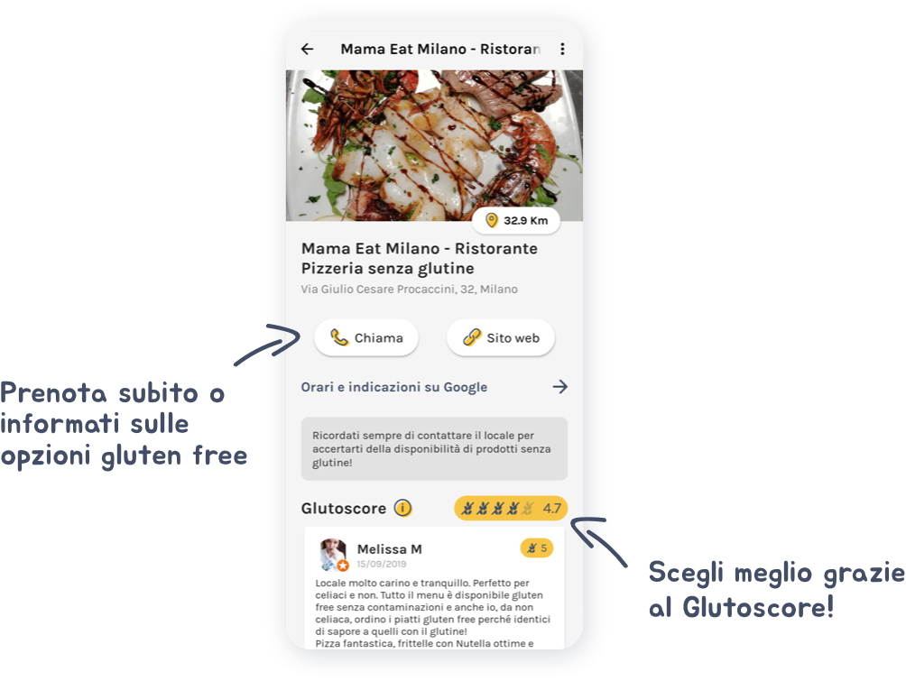 alle recensioni che menzionano il senza glutine. Infatti il Glutoscore è il nostro algoritmo che da maggiore rilevanza a recensioni che contengono termini come “glutine” o “celiachia”.